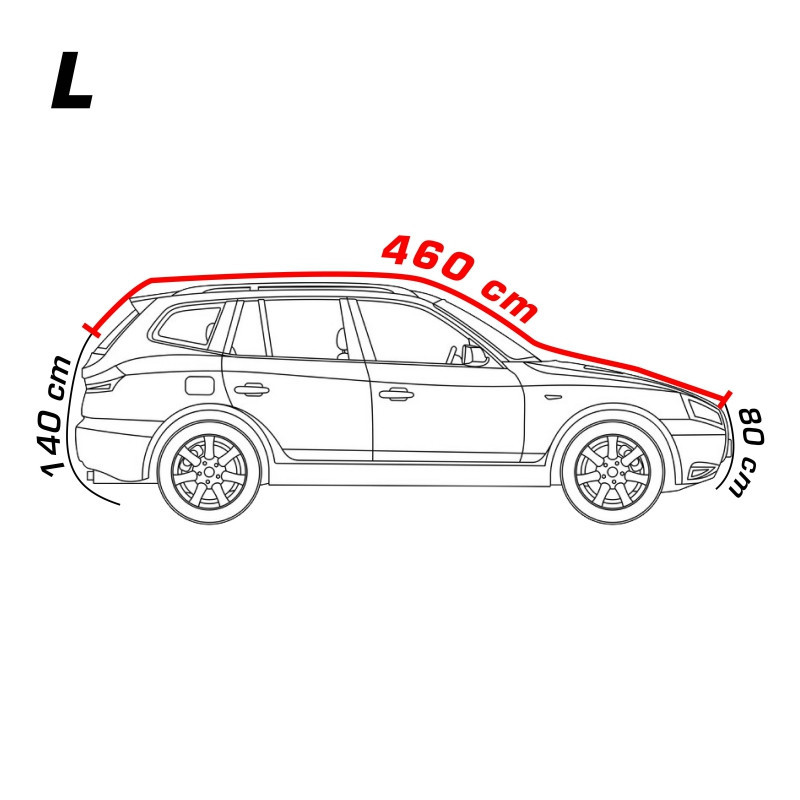Vhodná pre SUV a vyššie autá s hornou dĺžkou auta do 460cm (presnejšie nakreslené na obrázku). Je potrebné zmerať túto dĺžku. Ak je dĺžka väčšia treba už zvoliť dlhšiu plachtu (SUV XL)