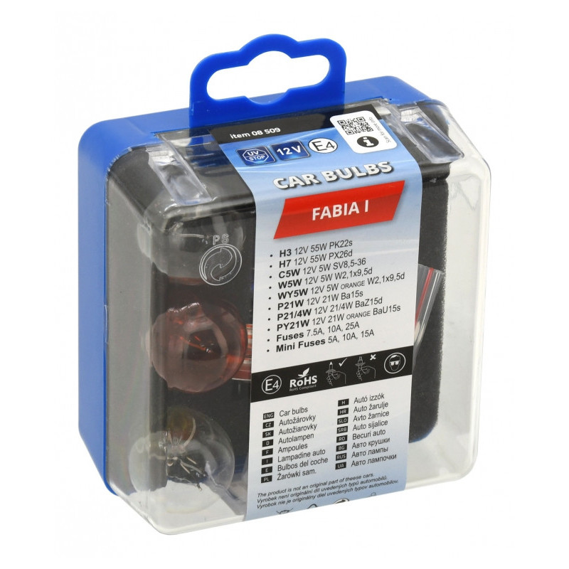 Využite ponúkanú pomoc prostredníctvom tejto plastovej krabičky plnej užitočných žiaroviek a poistiek pre vozidlo Škoda Fabia I. V prípade rozbitia či prasknutia žiarovky môžete ľahko tento problém opraviť len za niekoľko minút. Len niekoľko okamihov a trochu umu vás delí od vrátenia automobilu späť na cestu. Náhradné diely môžete mať vždy po ruke vďaka tejto súprave. Súprava obsahuje naozaj širokú paletu potrebného príslušenstva. Plastový obal zaistí maximálne bezpečie prevážaných komponentov. Vďaka tomu sa nemusíte báť o zničenie jemných drôtikov autožiaroviek.