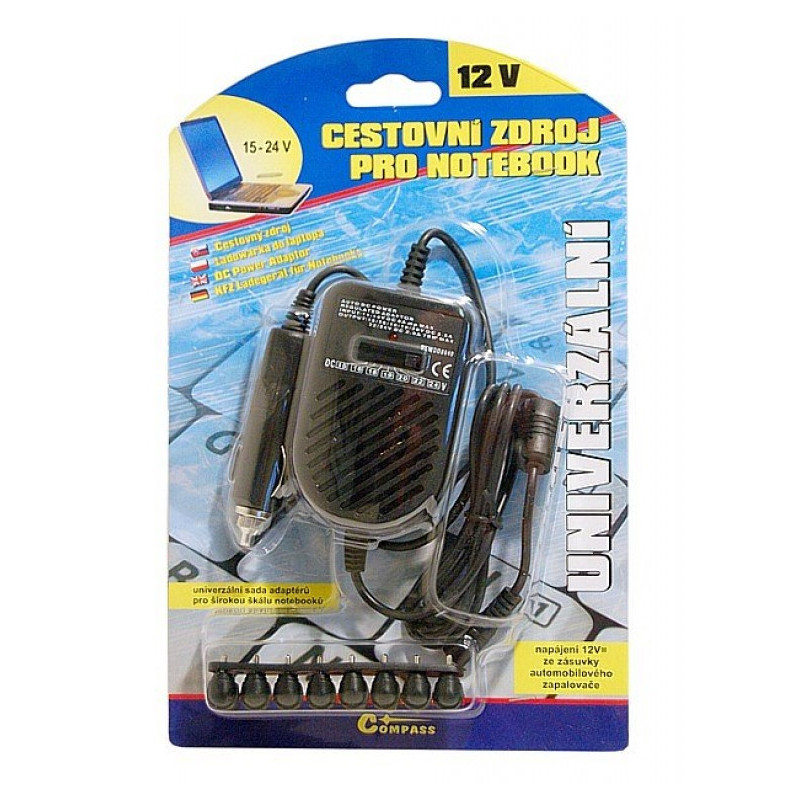 Univerzálne zariadenie pre napájanie a dobíjanie notebookov s napájacím napätím v rozmedzí 15-24 V. Napájanie zdroja pomocou zástrčky automobilového zapaľovača 12V. Súčasťou balenia je sada univerzálnych adaptérov pre širokú škálu notebookov.