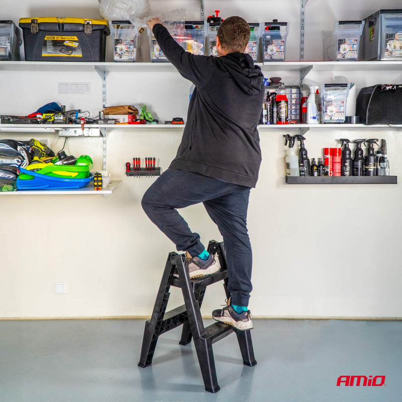 Dielenský rebrík – taburetka 51,5 cm 150 kg AMiO-04267 je praktický a stabilný pomocník do dielne, garáže alebo domácnosti. Je vhodný na dosiahnutie vyšších polôh pri práci, ako aj na sedenie počas prestávok.