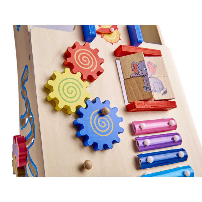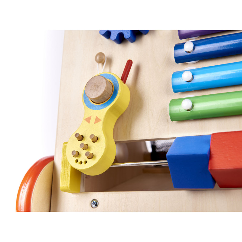 Farebné prvky priťahujú oko a malé ručičky svojimi farbami. Vďaka neutrálnej drevenej základni hračka zároveň neposkytuje dieťaťu nadmerné podnety.