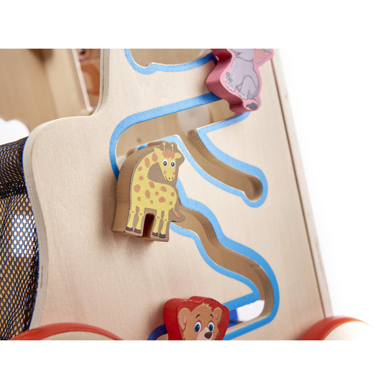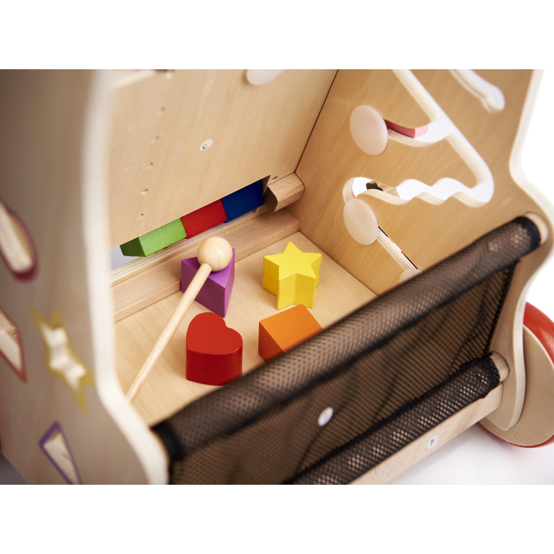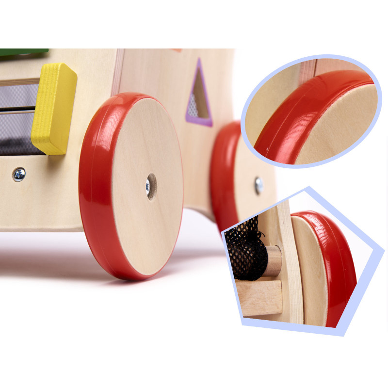 Základňa chodítka je zároveň krabicou, do ktorej padajú bloky z triediča. Možno v ňom uložiť a prepravovať činelovú paličku a mnoho ďalších hračiek. Debna je zabezpečená sieťou.