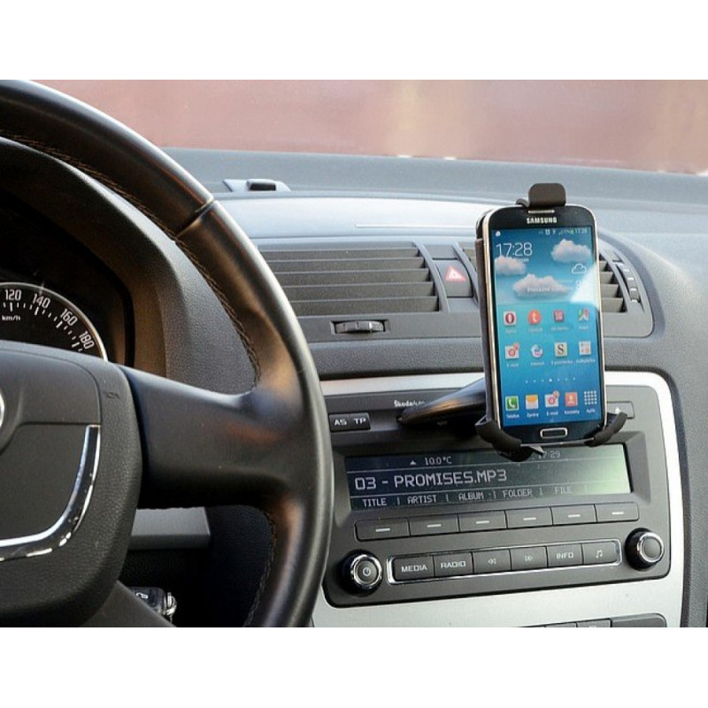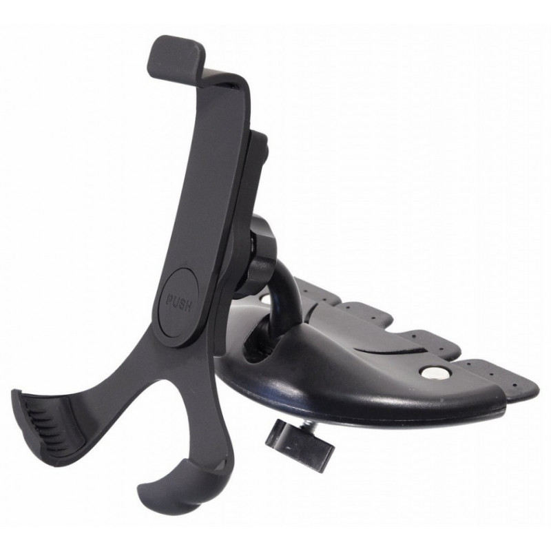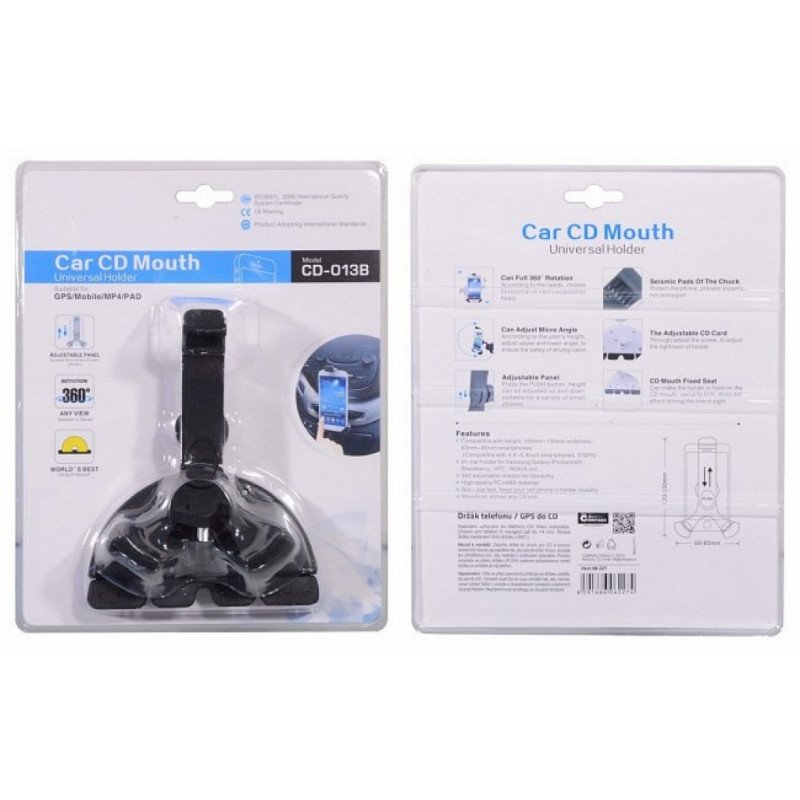 Držiak telefónu či navigácie, ktorý sa pripevní do štrbiny CD disku autorádia. Vhodné pre telefón či navigáciu (až do 14 cm). Široká škála nastavení uhlov držiaku (360 °) umožňuje upnutie telefónu na šírku i na výšku a nastavenie ľubovoľného sklonu.Držiak sa jednoducho zasunie do otvoru pre CD a pomocou aretačnej skrutky sa zaistí tak, aby pevne držal. U bežných autorádií nebráni v prehrávaní vloženého CD a autorádio. Len pre prípad vybratie či vložení CD disku z / do autorádia je nutné držiak sňať. Pomocou ovládača v stredu držiaku (tlačidlo PUSH) je možné nastaviť požadovanú rozteč držiaku.
