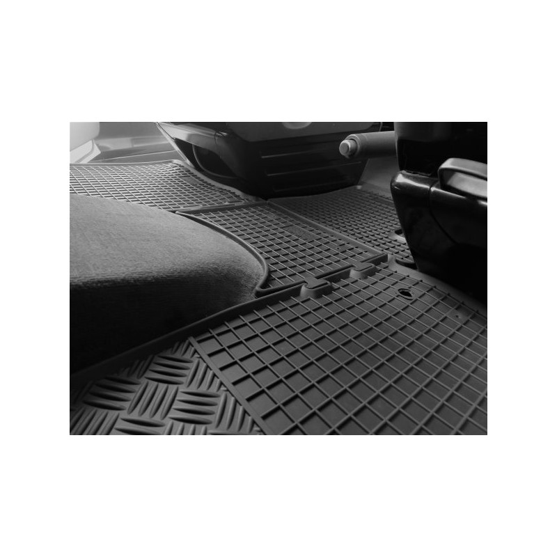 Gumené rohože na mieru pre VOLKSWAGEN T5 2m Transporter / Caravella / Multivan +TUNEL (4diel) (2003->). Rohože sú vyrobené presne na mieru interiéru daného vozidla. Lacnejšia náhrada originálnych rohoží.