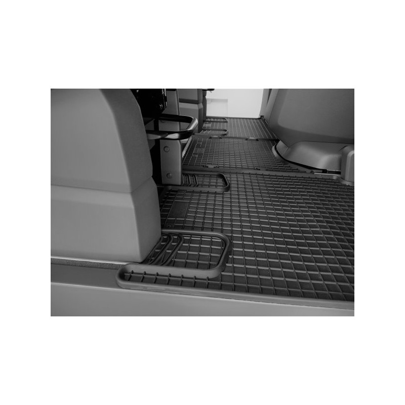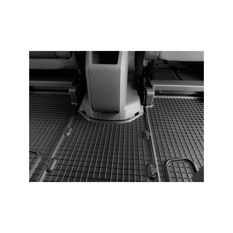 Gumené rohože na mieru pre VOLKSWAGEN T7 Multivan 2.rada (2022->). Rohože sú vyrobené presne na mieru interiéru daného vozidla. Lacnejšia náhrada originálnych rohoží.