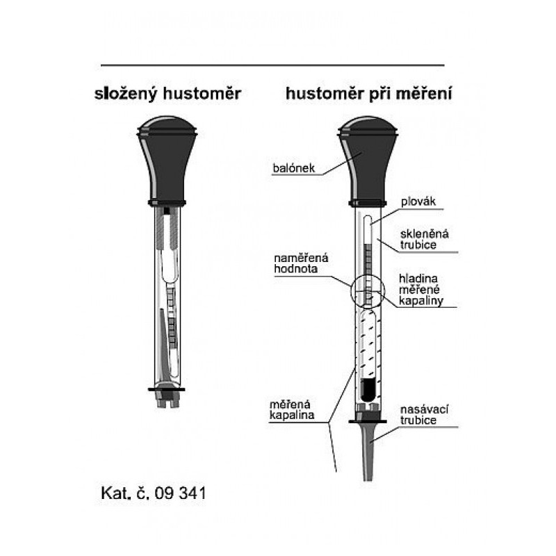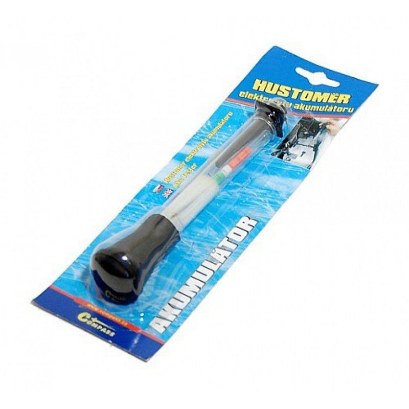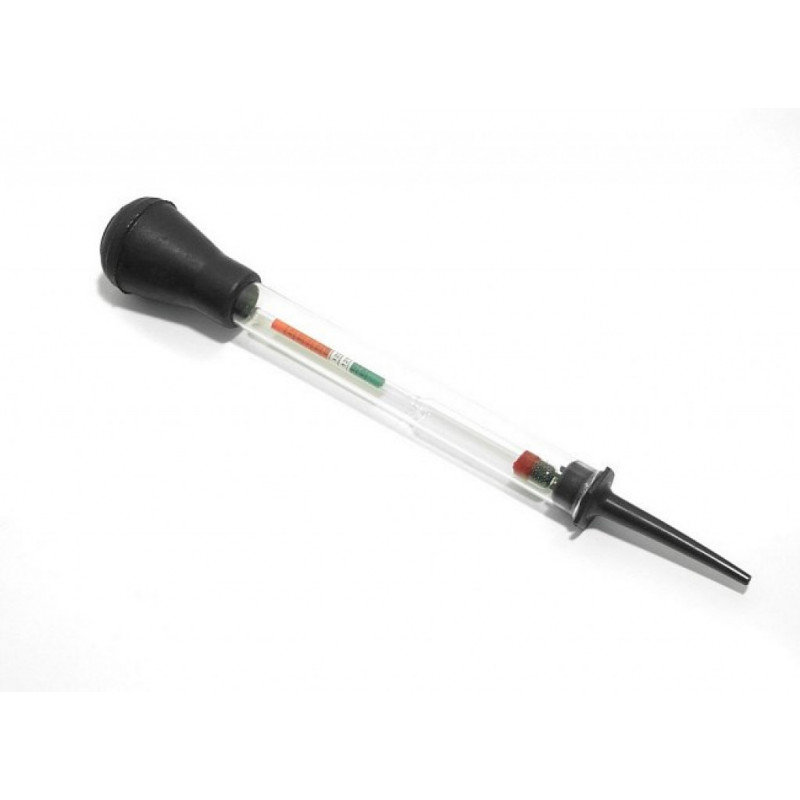 Sklenený hustomer s balónikom, nasávacou trubicou a vnútorným plavákom, určený k meraniu elektrolytov akumulátora.
