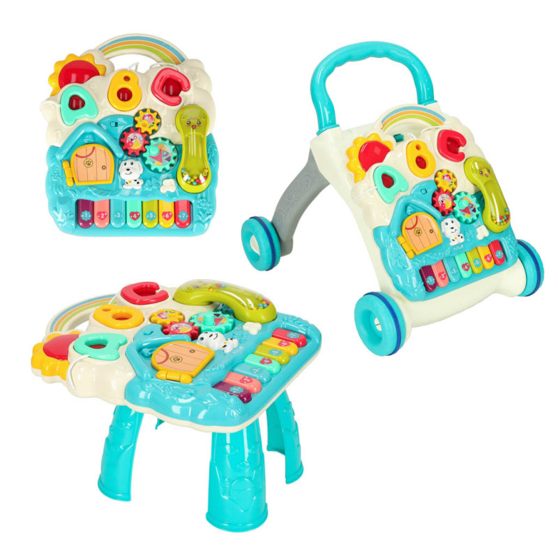 štyri produkty v jednom - prvky súpravy sa dajú vymeniť, čím sa výrobok zmení na hraciu tabuľu, vzdelávací stôl alebo praktické chodítko pre deti