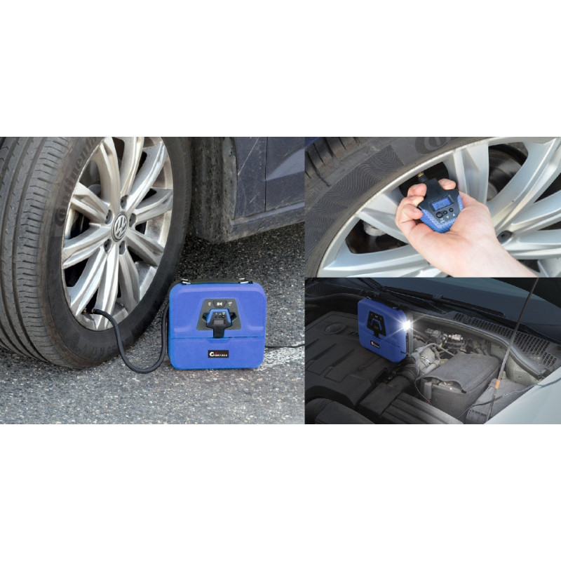 Digitálne vzduchový kompresor v kompaktnom prevedení. Napájanie 12V, dlhý kábel so zástrčkou do autozapaľovača. Adaptéry pre hustenie lôpt, matracov alebo bazénov, 4x náhradné čiapočka na ventil Auto stop - kompresor nahustí pneumatiku na vopred nastavený tlak a následne automaticky kompresor vypne. Vstavaný odnímateľný pneumerač, zobrazuje nameraný tlak v niekoľkých rôznych jednotkách. Vstavané svietidlo 9x LED pre osvetlenie pracovného priestoru. Pred použitím dôkladne prečítajte priložený návod.