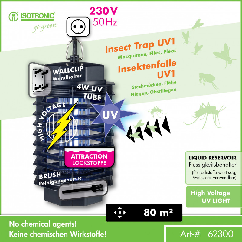 Elektrický lapač hmyzu vás zbaví hmyzu v noci a vy budete nerušene spať a nebudete mať štípance od komárov. Lapač funguje na UV žiarovku, ktorá priláka hmyz. Privolaný hmyz dostane elektrickým prúdom a odpadá do zberný nádobky. Nádobka je potreba raz za čas vysypať.