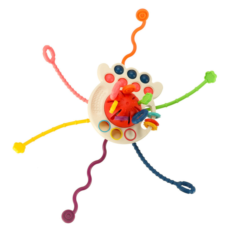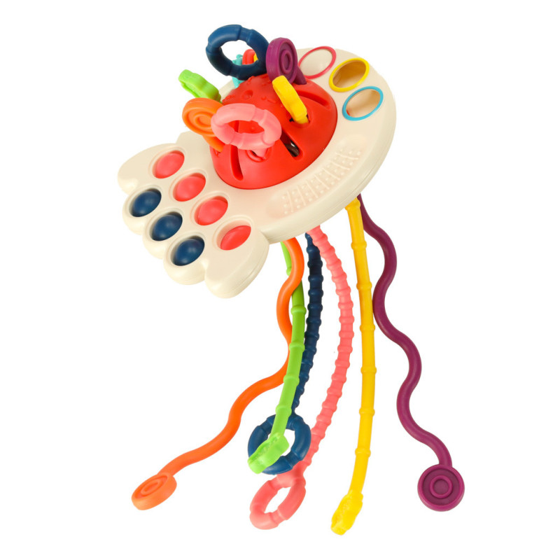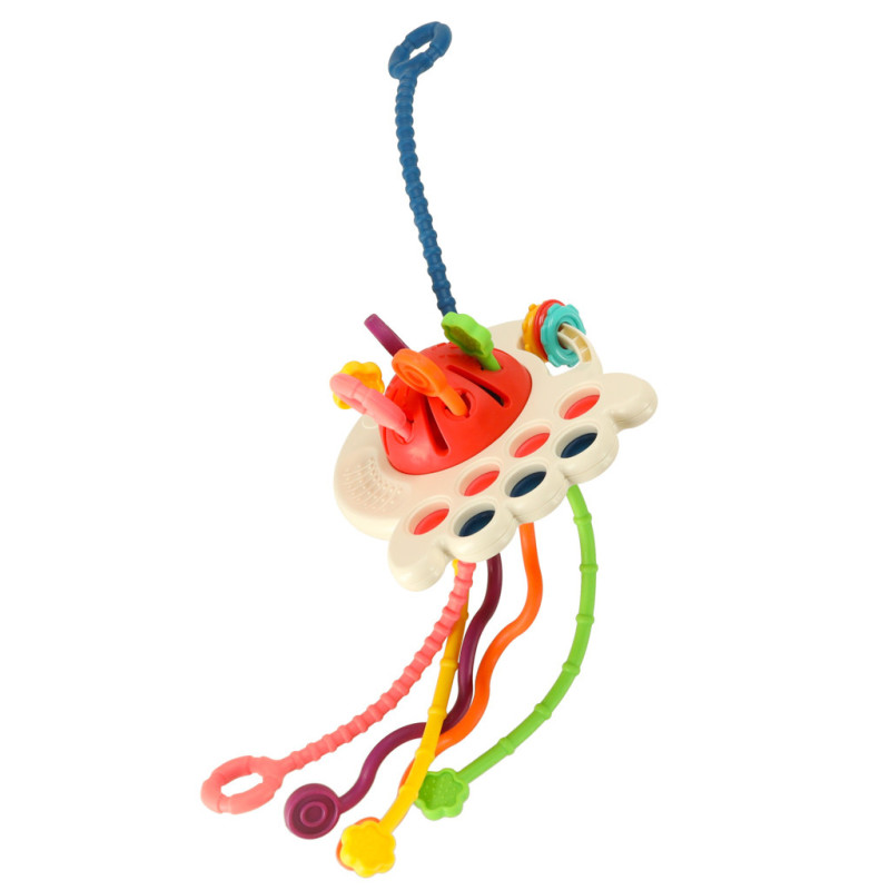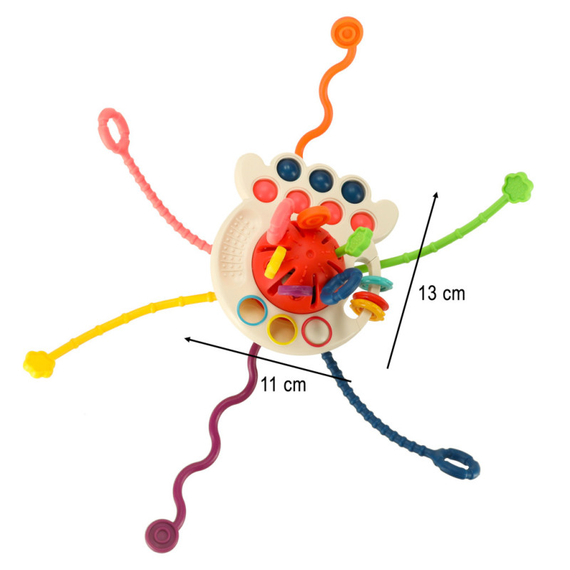 Táto senzorická hračka je ideálna pre vaše dieťatko. Šesť mäkkých, farebných šnúrok s rôznymi textúrami je ideálnou hračkou pre malé rúčky. Ťahanie, stláčanie, hryzenie - každý moment je novým zmyslovým zážitkom. Ďalšie prvky, ako je posuvný puk a silikónové gombíky, rozvíjajú manuálne zručnosti a koordináciu oko-ruka. Hryzátko je dokonalým spôsobom, ako zabaviť vaše dieťa a zároveň upokojiť boľavé ďasná počas prerezávania zúbkov. Sledujte, ako vaše dieťa zvedavo skúma rôzne textúry a farby hryzátka!