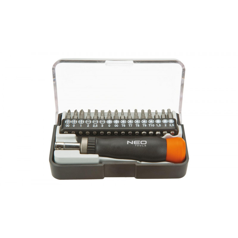 Sada precíznych skrutkovačov NEO obsahuje rukoväť a 16 obojstranných 30 mm nástavcov (ploché, krížové, Torx a šesťhranné). Magnetické čepele sú vyrobené z mimoriadne odolnej chróm-molybdénovej ocele. Otočná objímka v rukoväti umožňuje presné utiahnutie skrutky. Rukoväť, ktorá je vyrobená z dvoch materiálov, je odolná voči chemikáliám, olejom a tukom. Balené v praktickom kufríku. Certifikát TÜV Rheinland zaručuje vysokú kvalitu a spoľahlivosť produktu. Značka NEO spĺňa očakávania profesionálov.