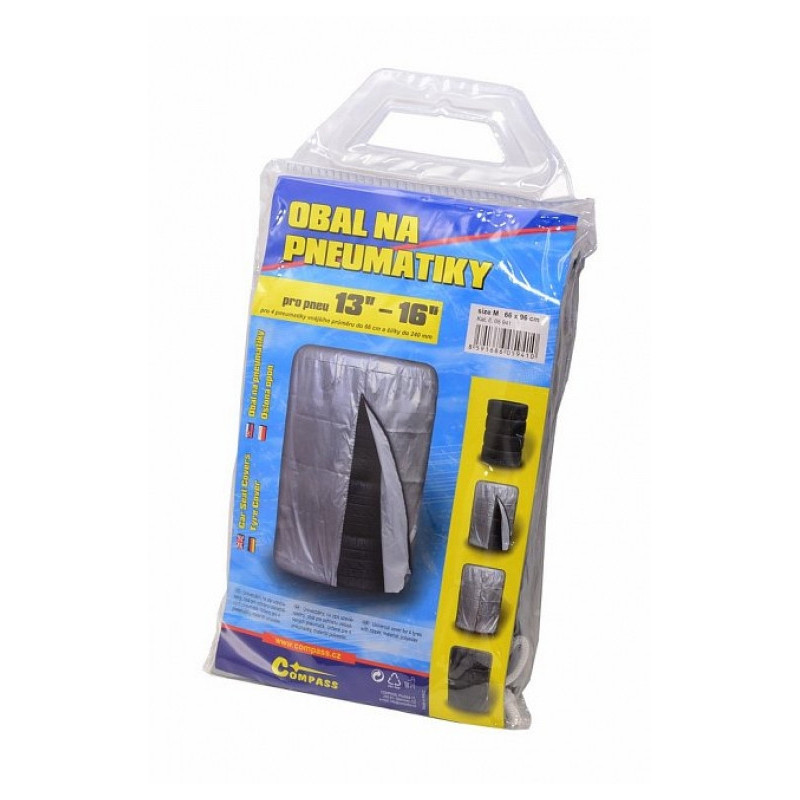Obal (plachta) na 4 pneumatiky, na zips uzatvárateľný. Veľkosť 66 x 96 cm, vhodné pre 13 - 16" pneumatiky vonkajšieho priemeru do 66 cm a šírky pneu do 240 mm.