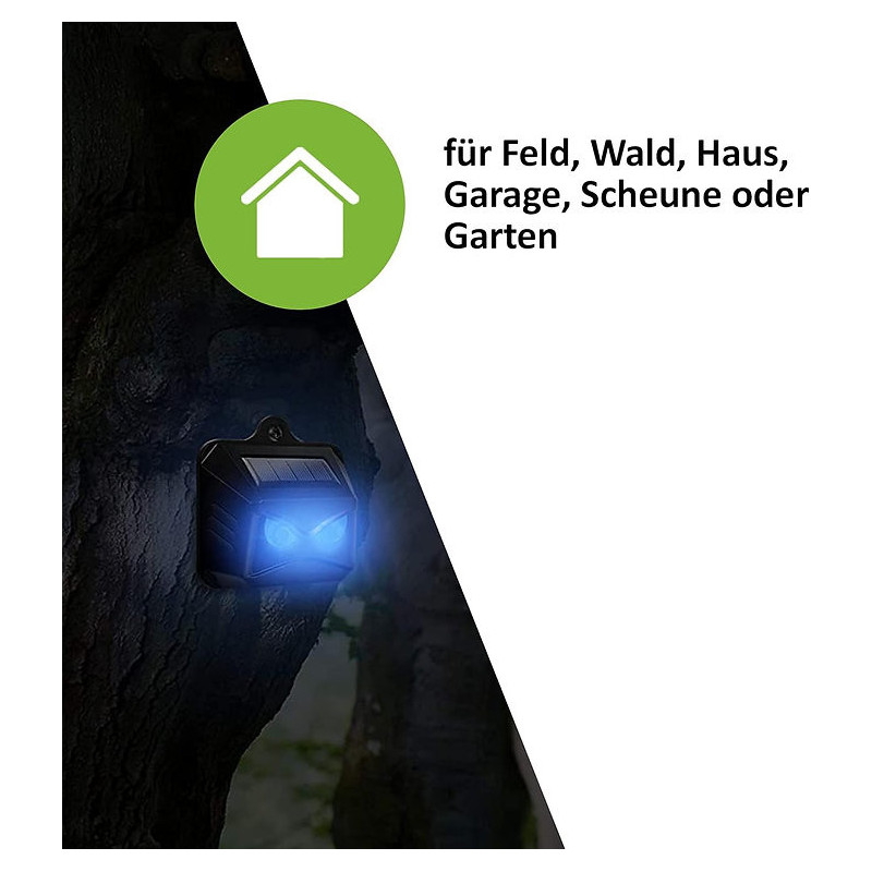 Toto zariadenie vyháňa nežiaduce, rušivé zvieratá zo záhrady . V noci automaticky dráždi divé zvieratá blikajúcim svetlom a vyháňa ich zo záhrady, sadov a terasy. Jednoduché použitie: solárne napájanie, nabíjanie vstavaných batérií pomocou slnečnej energie. Zapnite a umiestnite do výšky očí zvierat, aby ste ich odohnali.