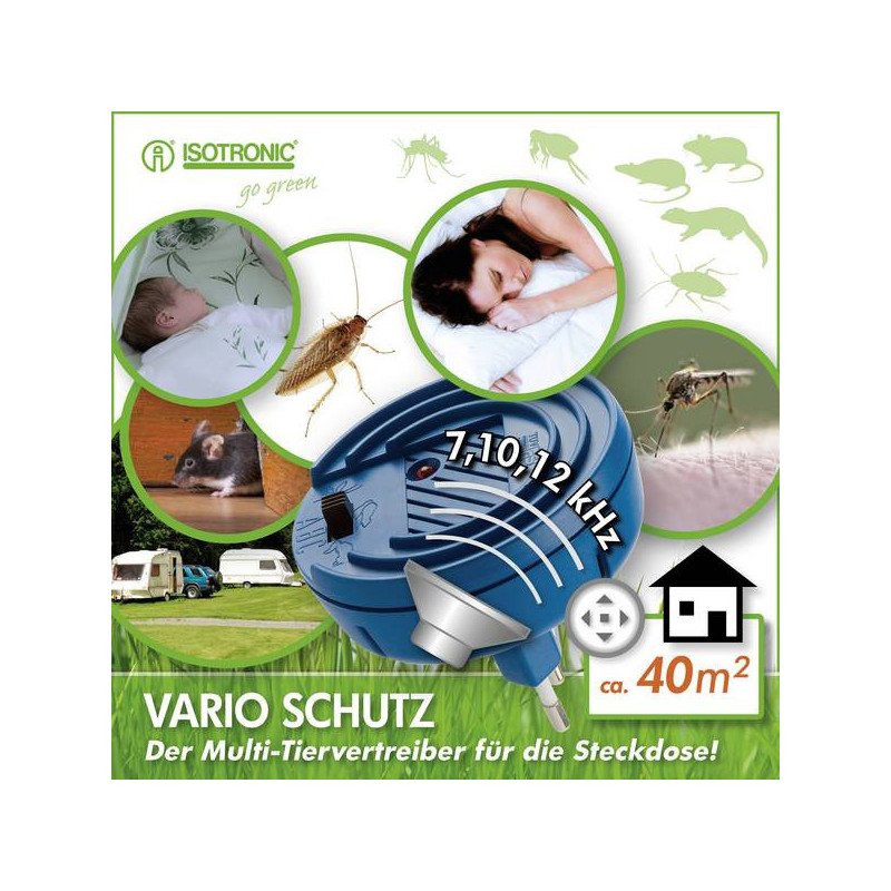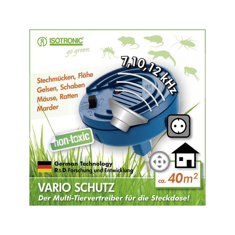 Vario - ochrana pracuje s tromi frekvenciami: cca 7.000 Hz proti komárom a blchám, cca 10.000 Hz proti myšiam a potkanom, 12.000 Hz proti kunám, švábom, „rusom“.