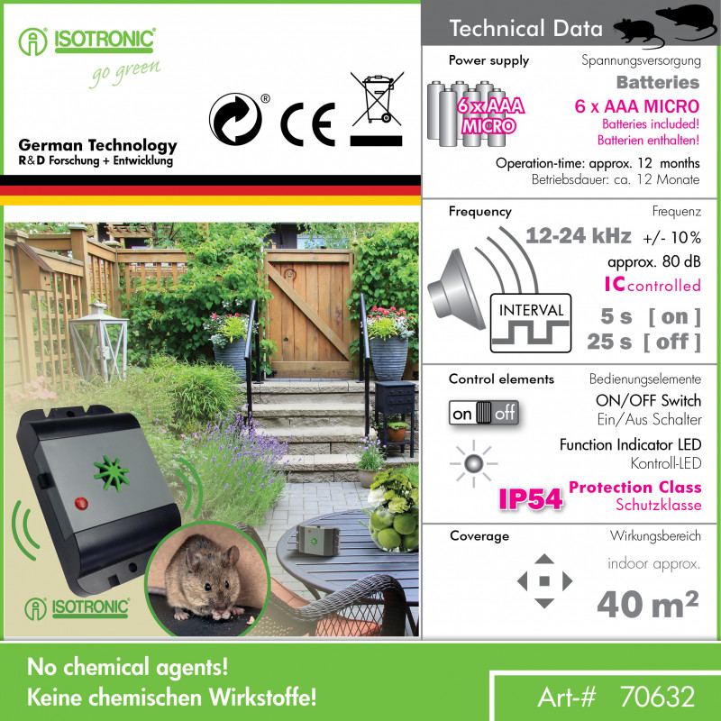 Odpudzovač - plašič ISOTRONIC slúži k ochrane priestoru v ktorom je umiestnený pred hlodavcami a kunami. Je teda možné ho využiť ako odpudzovač-plašič myší, potkanov, krýs, kún a lasičiek. Generuje špecifické ultrazvukové signály na vysokom ultrazvukovom kmitočte, ktoré sú pre drobné hlodavce a kuny veľmi nepríjemné, takže po krátkom čase chránený priestor opúšťajú a hľadajú si nové útočisko v iných objektoch, ktoré nie sú chránené.