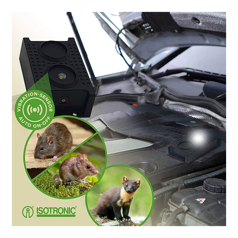 Repelent na kuny / myši so zvukovým signálom a LED diódou. Zariadenie odosiela v intervaloch cca. 50 sekúnd akustický signál. Frekvencia 12 - 24 kHz má nepríjemný vplyv na zvieratá, ako sú myši, kuny. Vstavaná LED dióda generuje 3x LED blesk každú minútu