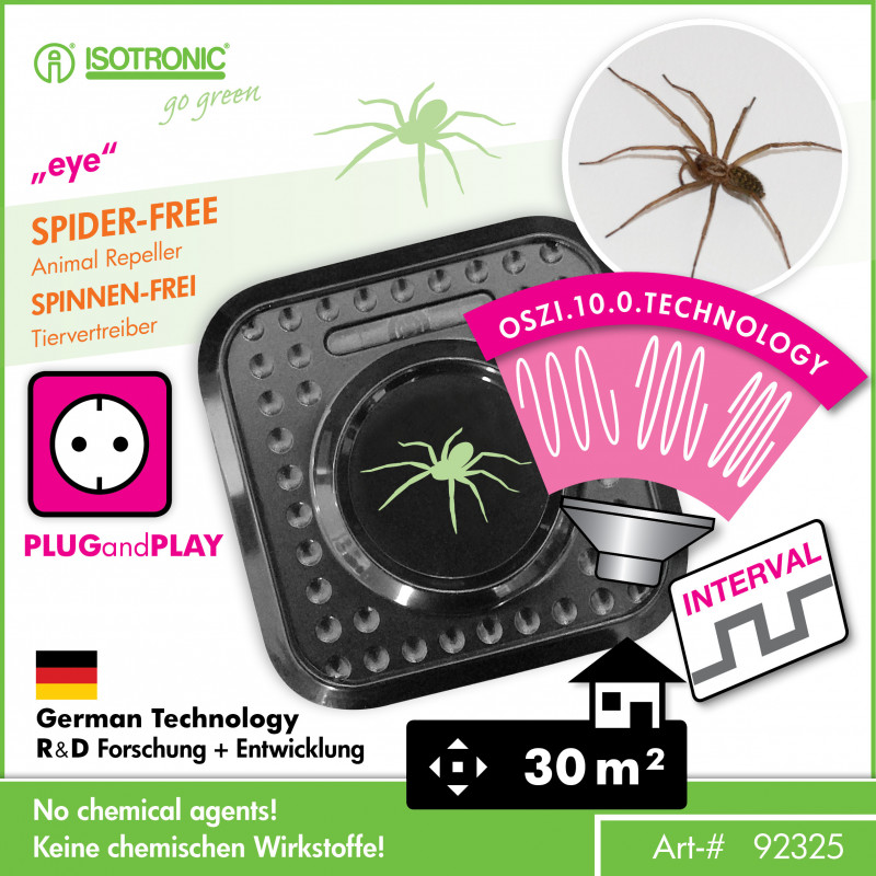Odpudzovač pavúkov vysiela vysoké zvuky, ktoré pavúkom vadia a opúšťajú chránený priestor. Pavúk sa domnieva, že v jeho okolí sa objavil nepriateľ, usilujúci sa ho pripraviť o potravu a rýchlo sa začne presúvať z Vášho dosahu.