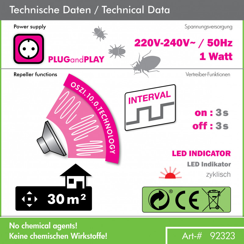 Jednoduché použitie - vložte do zásuvky 230 V na požadovanom mieste. Zariadenie teraz vysiela akustický signál v intervaloch (každé približne 3 sekundy dovnútra a približne 3 sekundy vypnutá)