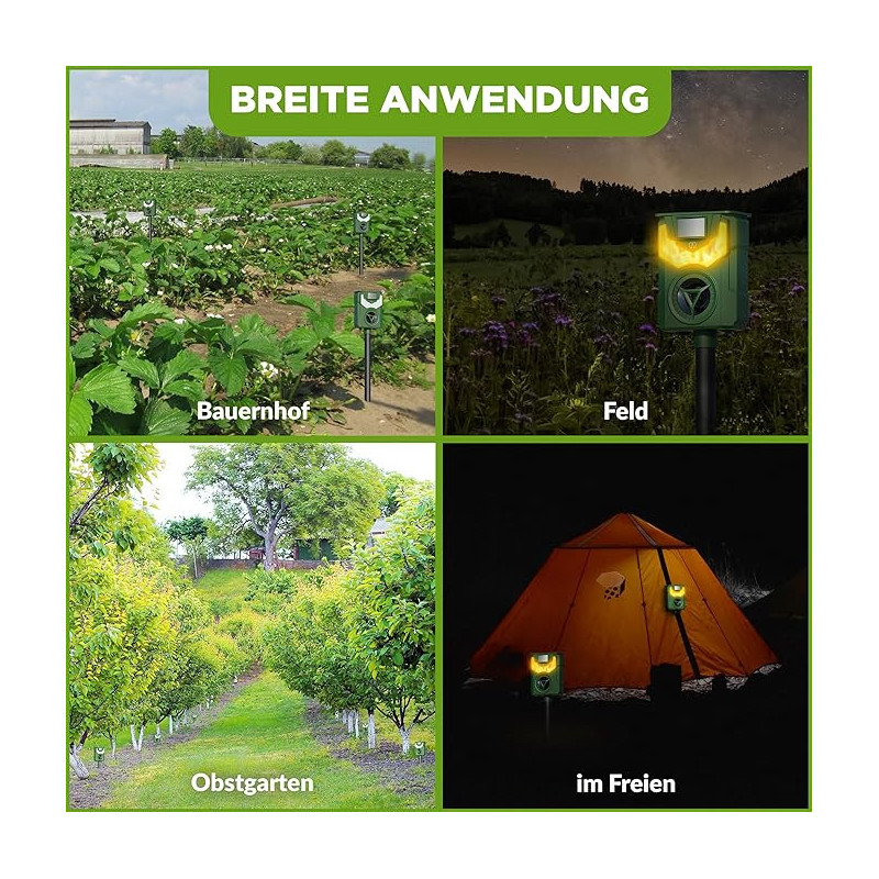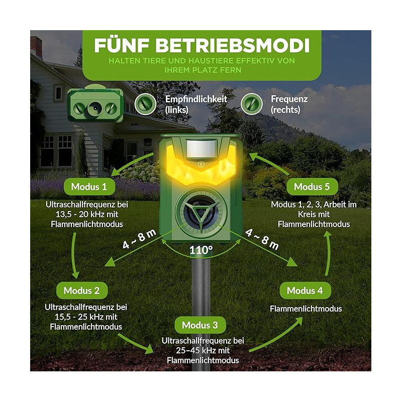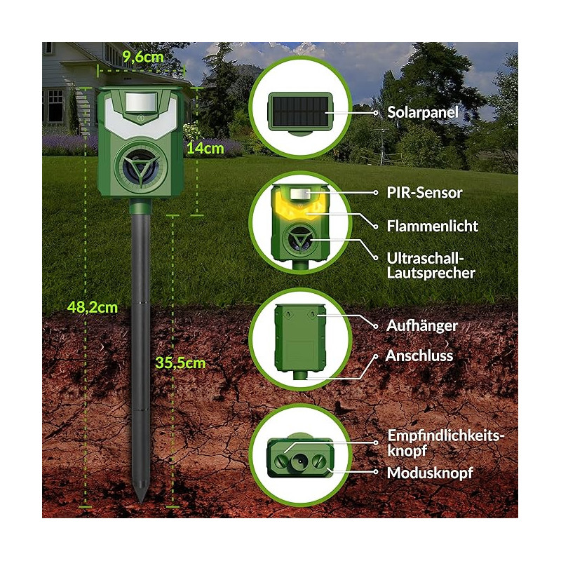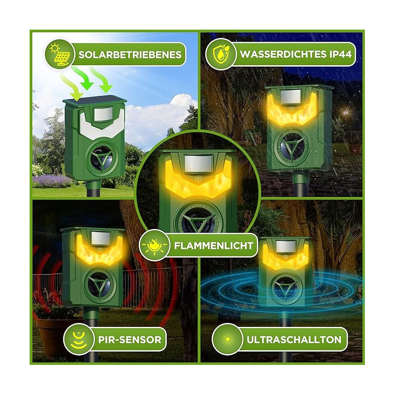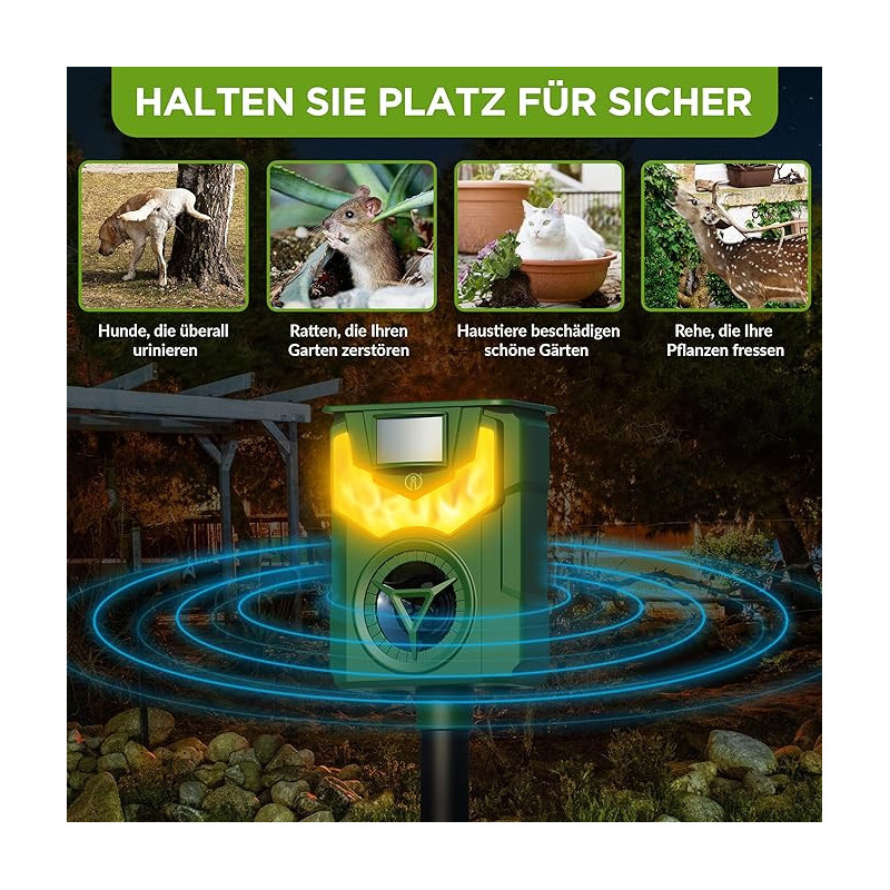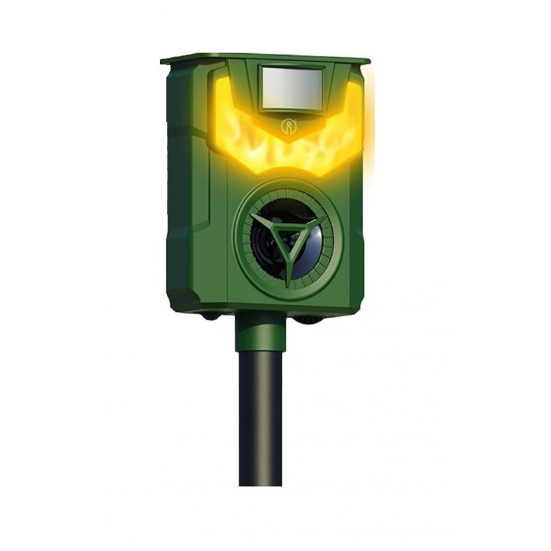 Tento novovyvinutý model poháňaný solárnou energiou Vám ponúka elektronický spôsob, ako pomocou frekvencií vyhnať otravné zvieratá z Vášho pozemku, alebo záhrady. Citlivý snímač pohybu spúšťa silnú