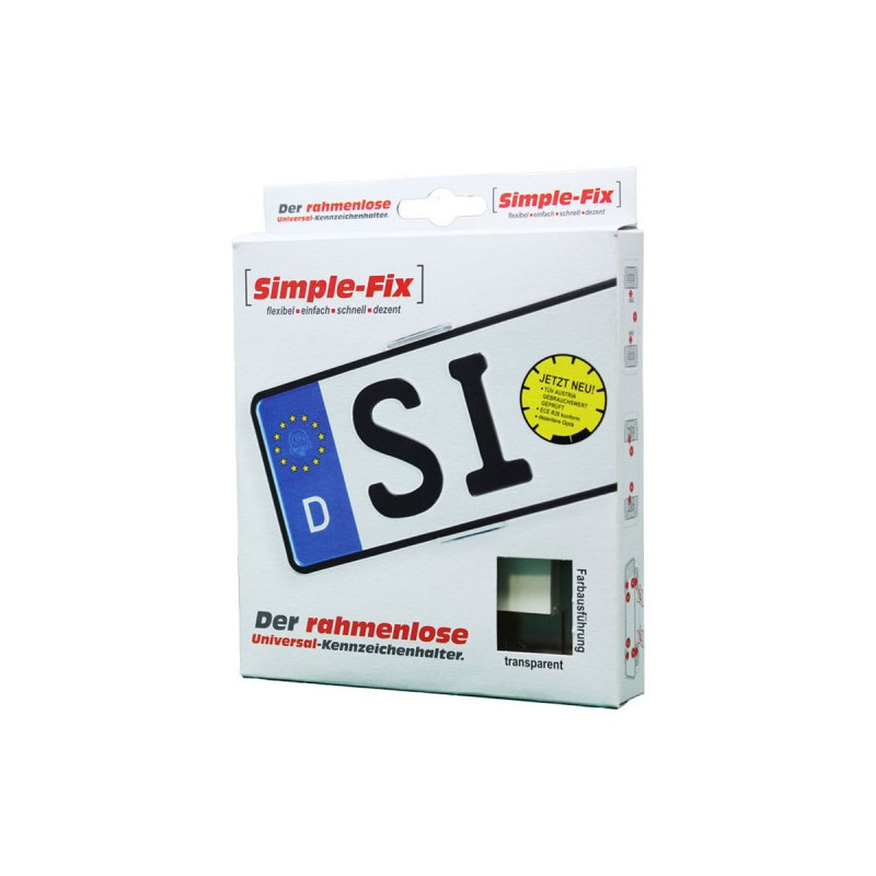 Nová univerzálna upevňovacia súprava Simple-Fix ponúka optimálnu možnosť jednoduchého upevnenia ŠPZ vpredu aj vzadu bez zbytočného vŕtania, no pritom je jednoduchá a bezrámová - takmer neviditeľná v priehľadnom prevedení, testované TÜV!