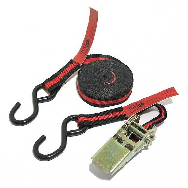 Upínací popruh vysokej kvality, s kovovou račňou, homologizácia TÜV / GS. Dĺžka 5 m, šírka 25 mm.