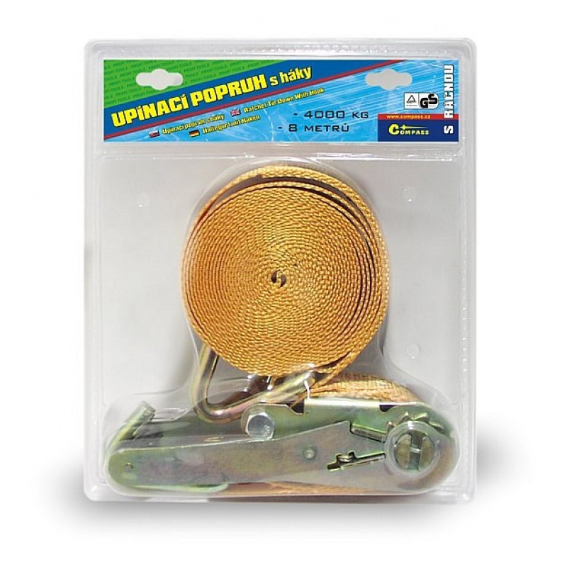 Upínací popruh s kovovou račňou a dvoma kovovými hákmi, dĺžka 8 m, šírka 50 mm, ťažná sila 4000 kg.