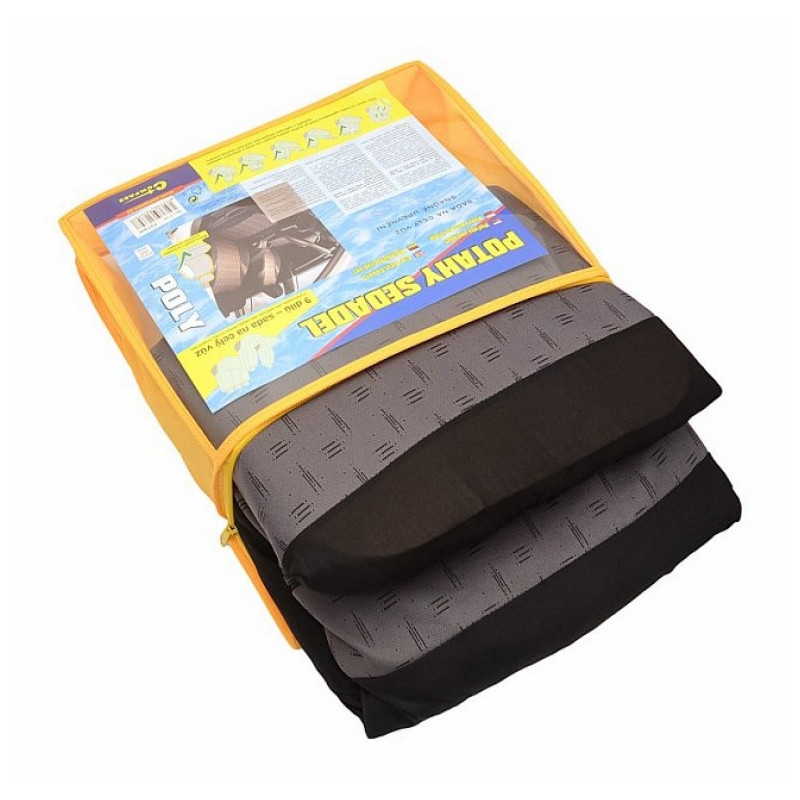 Poťahy sedadiel POLY, sada na celý automobil. Možno pripevniť na väčšinu bežne používaných automobilových sedadiel. Poťah možno použiť na sedadl&´ch, ktoré majú zabudovaný bočný airbag priamo v operadle predných sedadiel. Balenie obsahuje poťah na predné sedadlo (2x), zadný sedák (celý), zadné operadlo (pomocou zipsu deliteľné na 3 diely), opierku hlavy (5x). Vďaka zipsom na zadnej operadlovej časti je možné poťahy použiť aj na vozidlá s delenými zadnými sedadlami a operadla sklápať bez nutnosti sňatí poťahu.