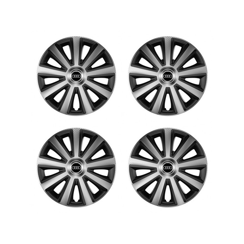 Puklice 14 Aviator carbon silver&black pre Audi na ocelové disky. Pre kolesá o veľkosti R14 so živicovými samolepkami Audi.Destinatar :