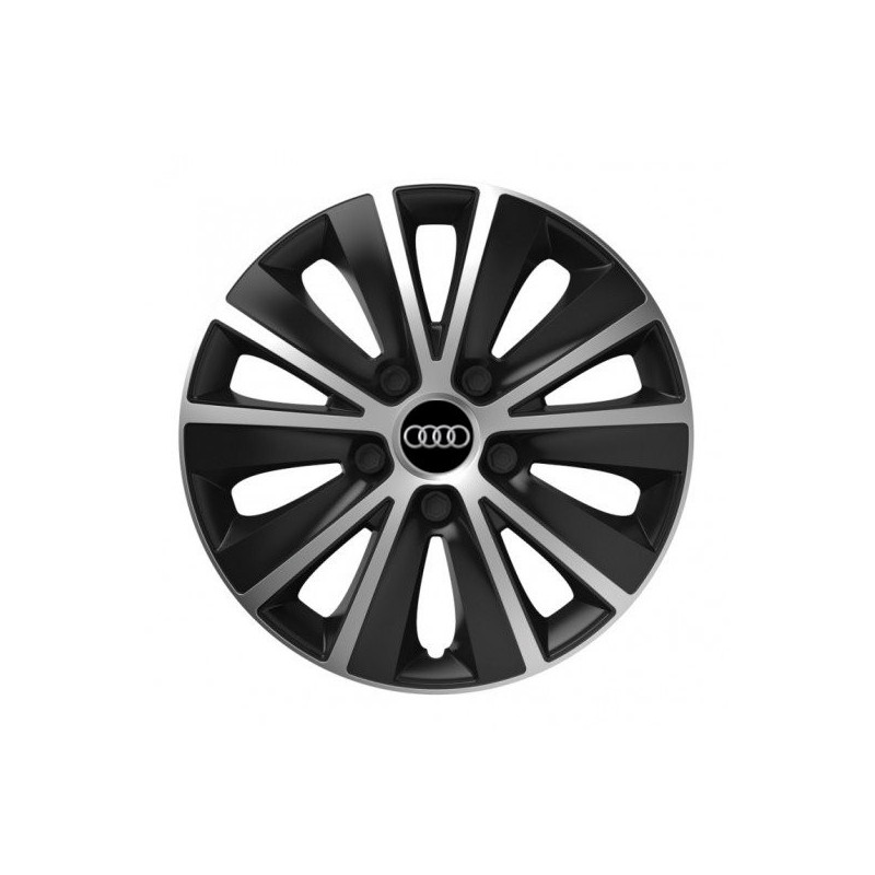 Puklice 15 RAPIDE silver and black pre Audi na ocelové disky. Pre kolesá o veľkosti R15 so živicovými samolepkami Audi.Destinatar :