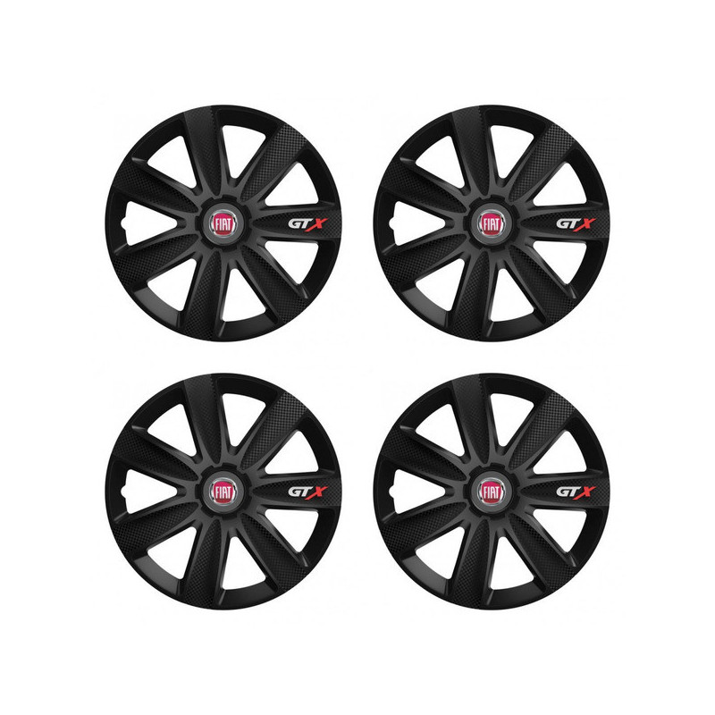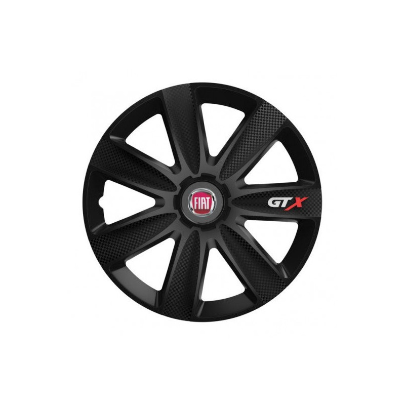 Puklice 14 GTX CARBON black pre Fiat (červené) na ocelové disky. Pre kolesá o veľkosti R14 so živicovými samolepkami Fiat (červené).Destinatar :