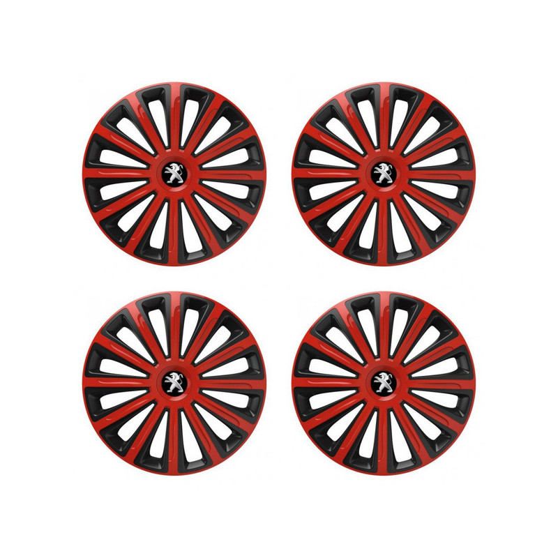 Puklice 15 TREND red and black pre Peugeot (staršie logo) na ocelové disky. Pre kolesá o veľkosti R15 so živicovými samolepkami Peugeot (staršie logo).Destinatar :
