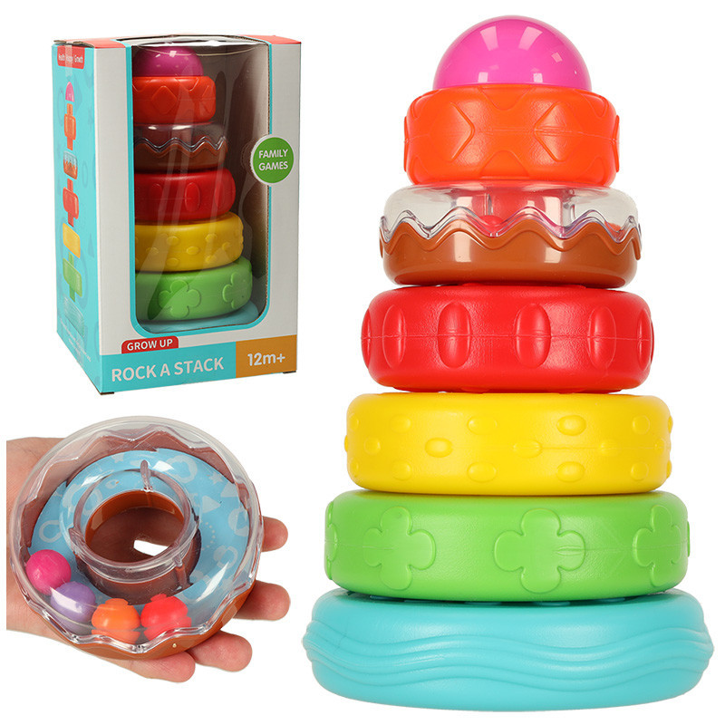 Sedem veľkých blokov sa dá poskladať na seba a vytvoriť tak pôsobivú pyramídu! Každý dielik má inú farbu a odlišnú štruktúru. Jeden z blokov má navyše v sebe guľôčky, ktoré môžete vidieť cez priehľadnú vrchnú časť.