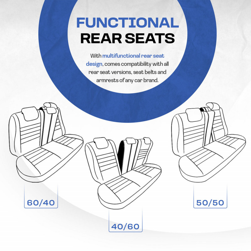 Poťahy majú zapínanie na zadnom sedadle, vďaka čomu pasujú na väčšinu sedadiel dostupných na trhu (nedelené pohovky).