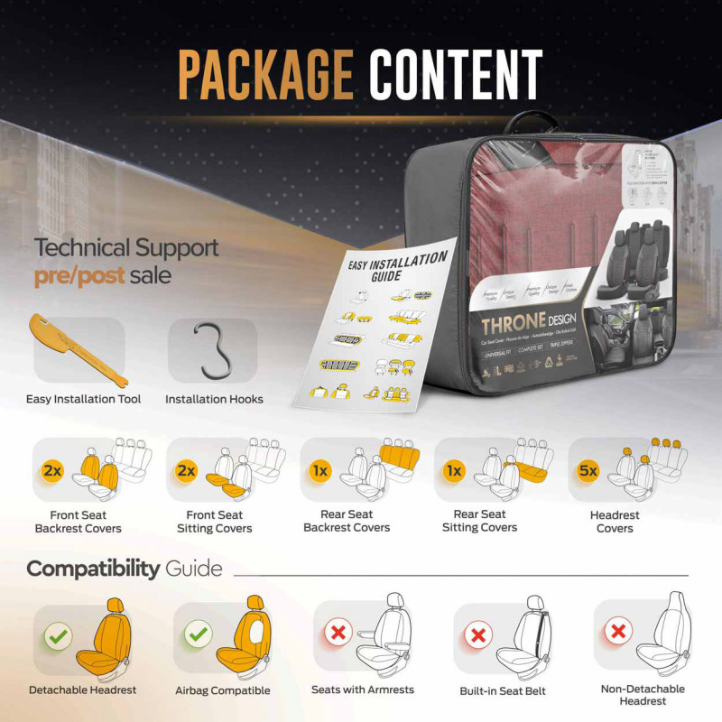 Poťahy majú zapínanie na zadnom sedadle, vďaka čomu pasujú na väčšinu sedadiel dostupných na trhu (nedelené pohovky).