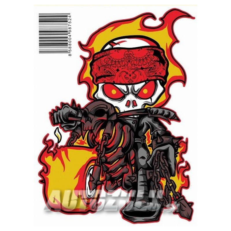 Krásna farebná tlačená samolepka motorka v plameni. Tlačená na bielu fóliu.