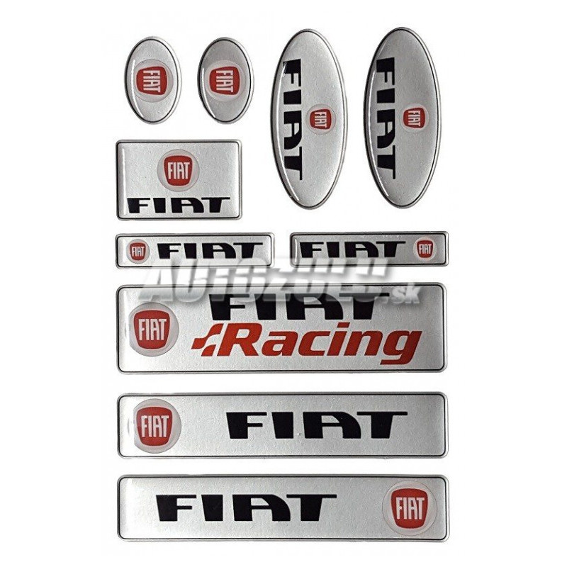 Sada živicových nálepiek Fiat rôznych rozmerov.