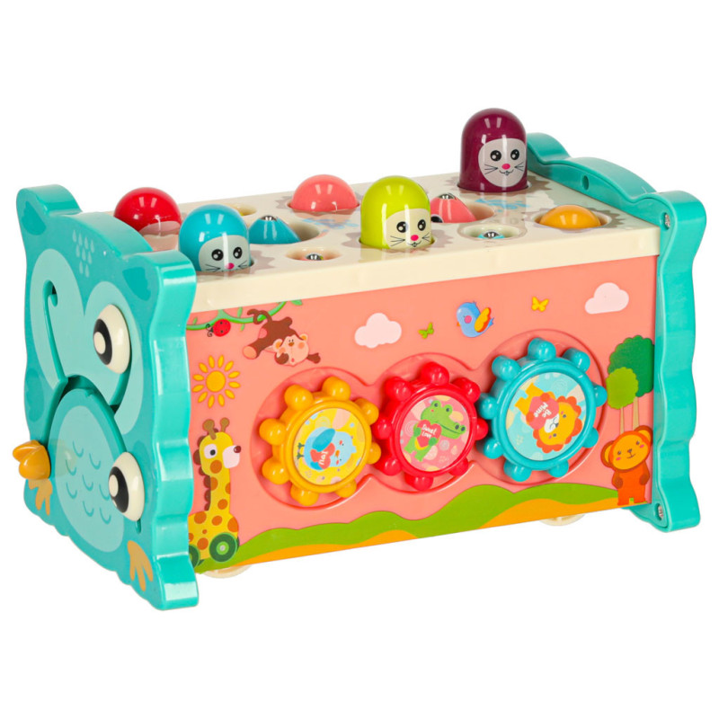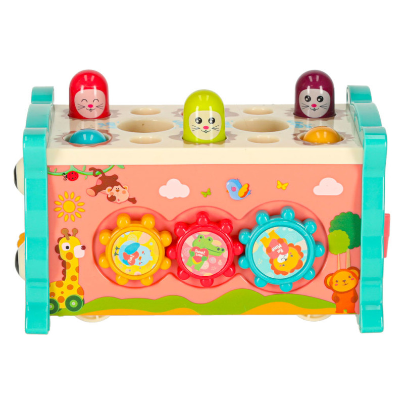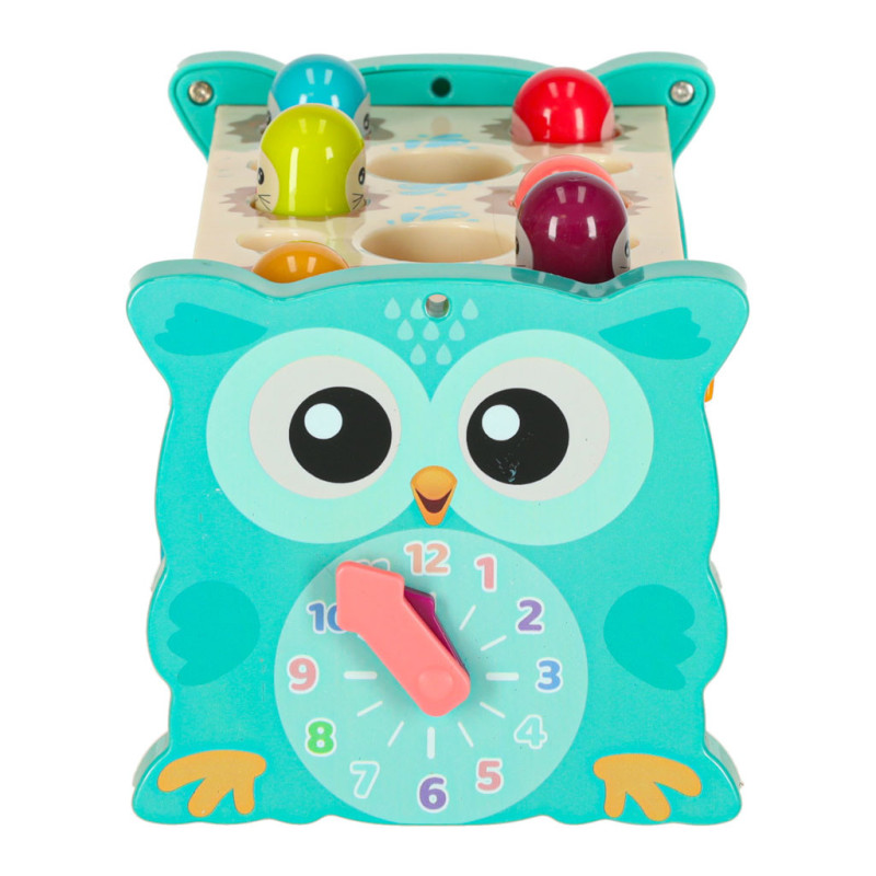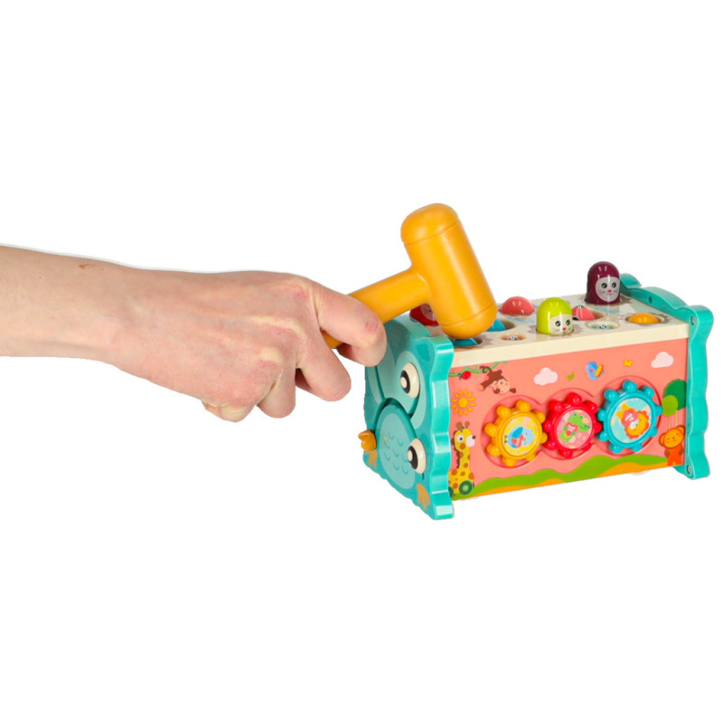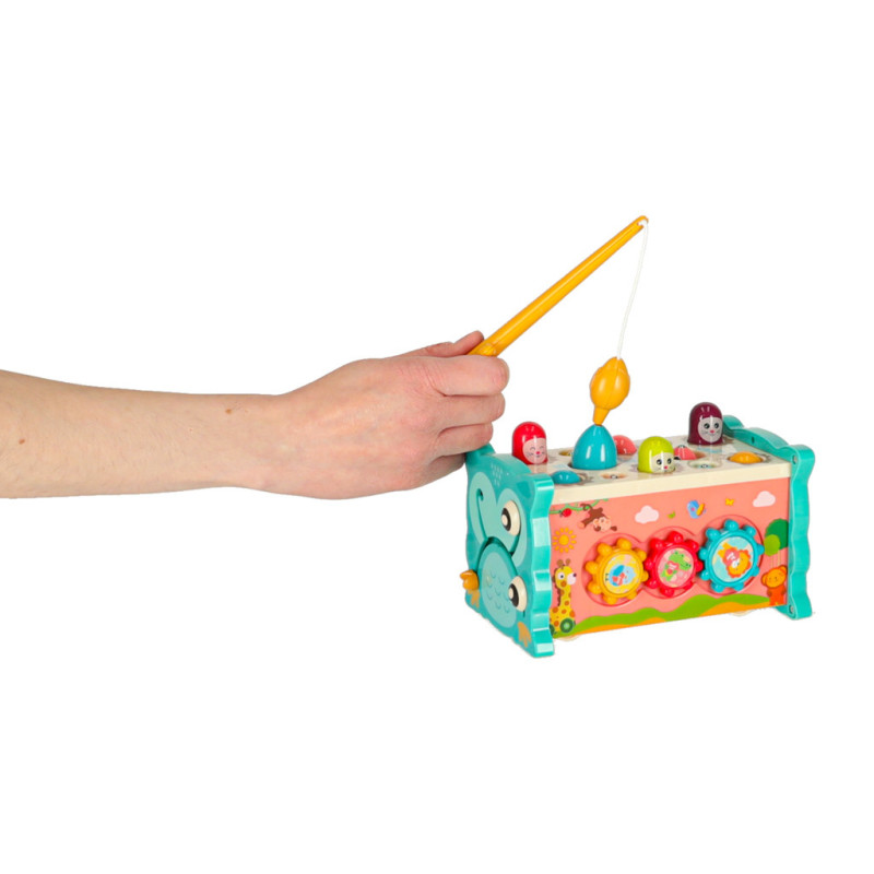 Jednou z hlavných atrakcií je možnosť zatĺkať malé zvieratká, ktoré sa objavujú, čím prinášajú radosť vášmu dieťatku a precvičujú jeho reflexy. Okrem toho hračka umožňuje chytať farebné rybky a červíky pomocou priloženého rybárskeho prúta, čo rozvíja presnosť a trpezlivosť. Dieťa sa tiež môže naučiť základy fungovania hodín, otáčať farebnými kolieskami a pohybovať autíčkami v bludisku. Vďaka rôznym aktivitámposkytuje súpravahodiny zábavy a zároveň stimuluje zmysly dieťaťa prostredníctvom intenzívnych farieb a rozmanitých tvarov.