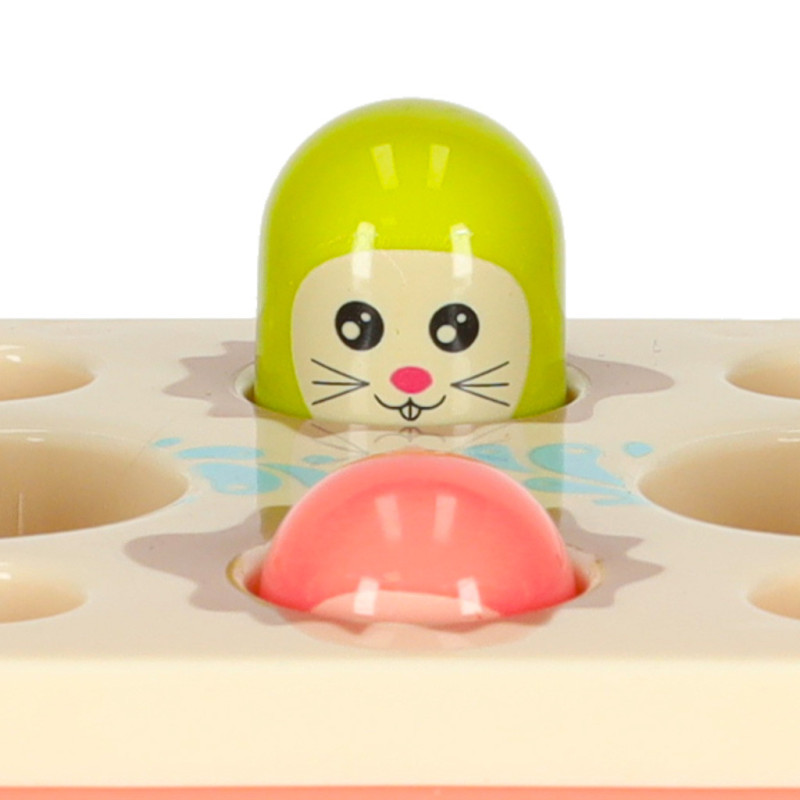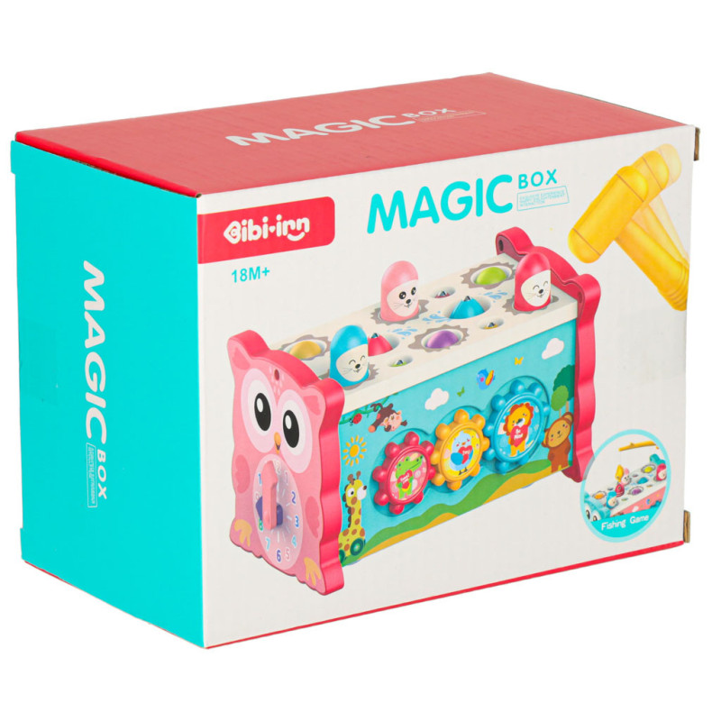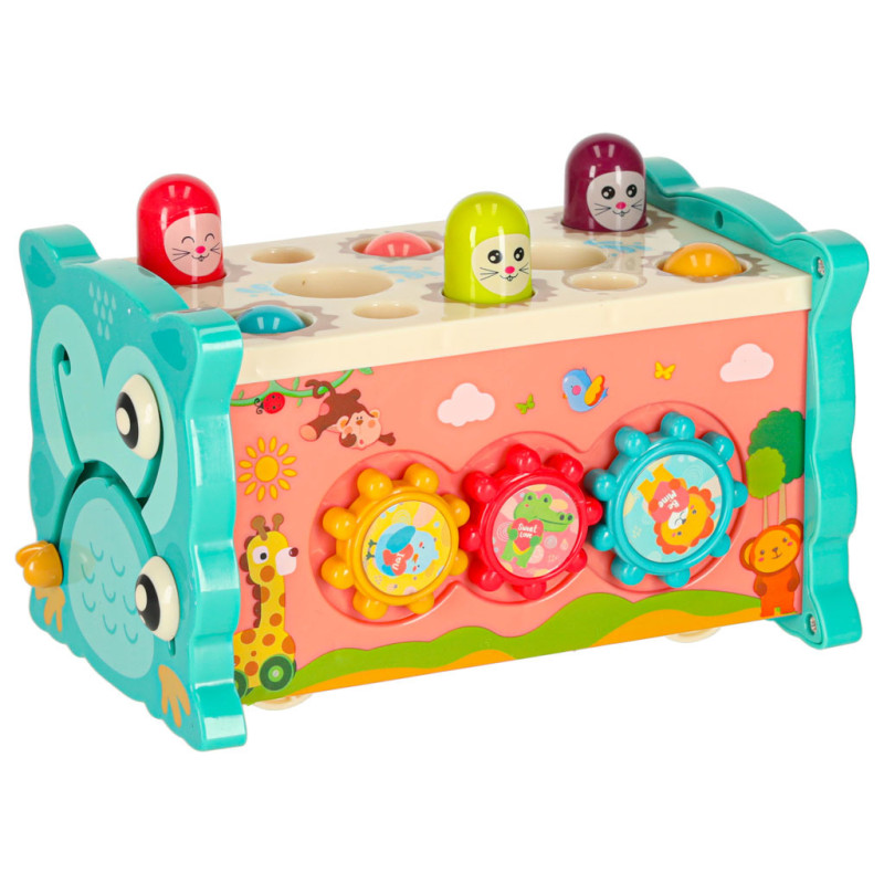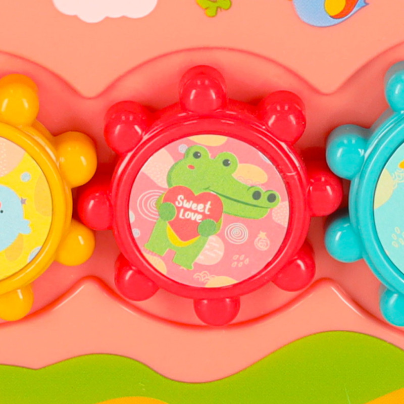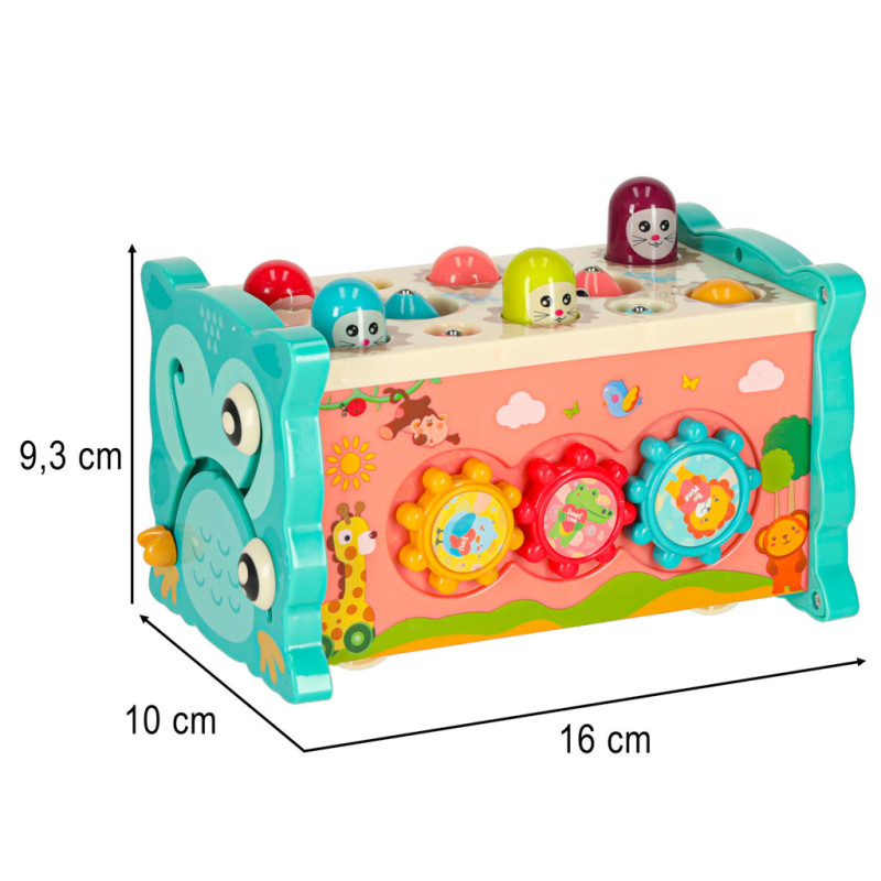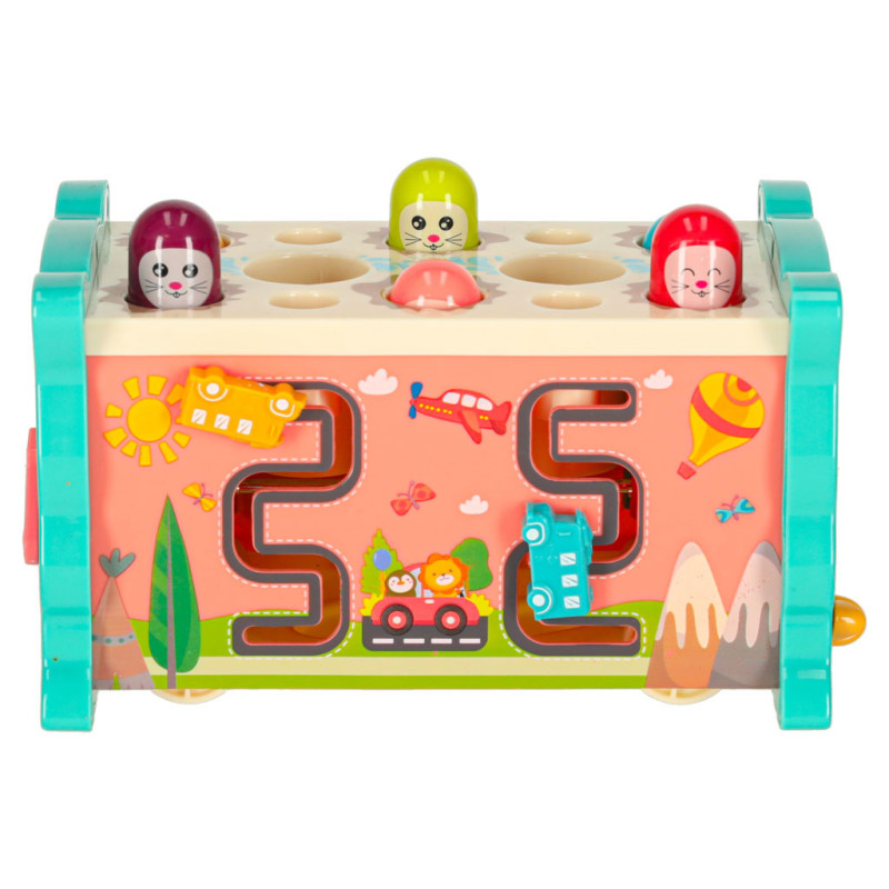 Jednou z hlavných atrakcií je možnosť zatĺkať malé zvieratká, ktoré sa objavujú, čím prinášajú radosť vášmu dieťatku a precvičujú jeho reflexy. Okrem toho hračka umožňuje chytať farebné rybky a červíky pomocou priloženého rybárskeho prúta, čo rozvíja presnosť a trpezlivosť. Dieťa sa tiež môže naučiť základy fungovania hodín, otáčať farebnými kolieskami a pohybovať autíčkami v bludisku. Vďaka rôznym aktivitámposkytuje súpravahodiny zábavy a zároveň stimuluje zmysly dieťaťa prostredníctvom intenzívnych farieb a rozmanitých tvarov.