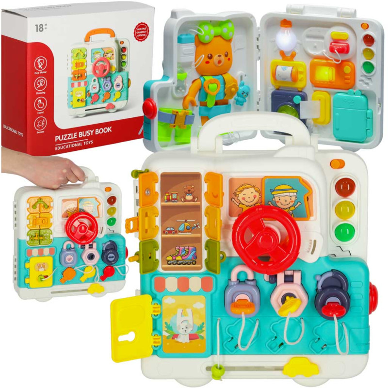 Senzorická manipulačná tabuľa montessori montessori kľučky medvedík XXL svetlo zvuk