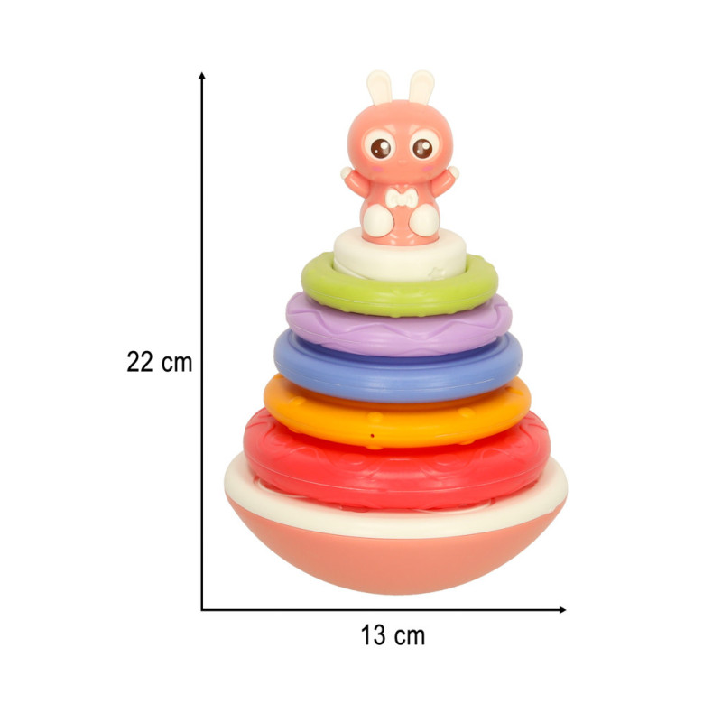 Hračka sa skladá z hojdacieho podstavca s malým kamarátom zajačikom apiatich diskov rôznych veľkostí. Úlohou dieťaťa je vrstviť disky jeden po druhom a postaviť dúhovú vežu. Pri každom umiestnení diskov sa z hračky ozve veselá melódia, ktorá batoľa povzbudí k ďalšej hre.