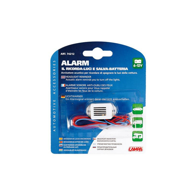 ► Pri vypnutí zapaľovania, alebo pri otvorení dverí automobilu akusticky signalizuje nevypnuté svetlá vozidla ► Ideálna ochrana proti nechcenému vybitiu akumulátora ► Pripevnenie prilepením, alebo priskrutkovaním ► Materiál: plast ► Farba: biela alebo čierna Montáž: • Pred montážou zaistite bezpečnú trasu a vloženie káblov. • Pripojte červený kábel Alarmu na poistkový panel, alebo na poistkový panel predných svetiel. • Pripojte modrý kábel ALARMU na poistkový panel rádia, alebo na poistkový panel stieračov. TEST: So zapnutým zapaľovaním zapnite predné svetlá. • Vypnite zapaľovanie. • ALARM by mal zaznieť a upozorniť na zapnuté svetlá. Inštrukcie na umiestnenie alarmu • Umiestnite ALARM na vybraté miesto pomocou samolepiacej pásky. • Pri umiestnení ALARM pritlačte.