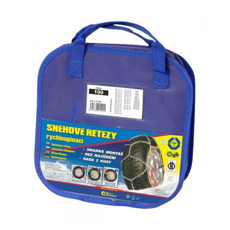 Rýchloupínacie snehové reťaze, krížová stopa, sada 2kusy. Určené pre autá do hmotnosti 2000kg. Homologizácia GS TÜV, očko reťaze 3mm, 9mm. Balené v praktickej uzatvárateľnej textilnej taške zo silného materiálu.