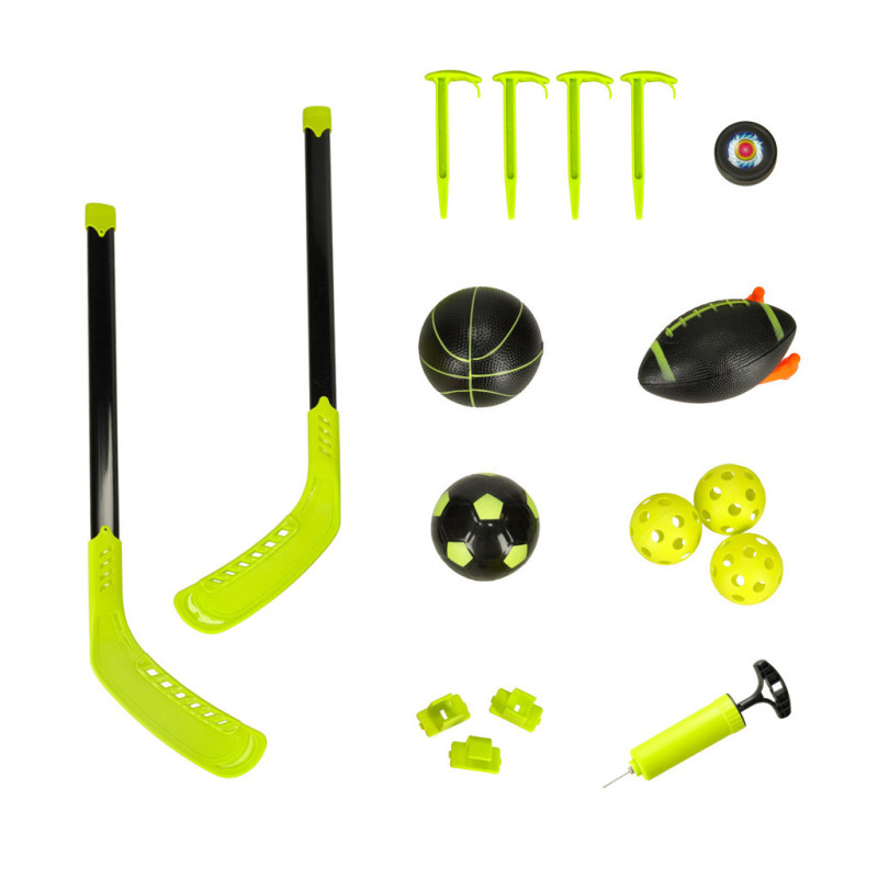 Futbal, basketbal, hokej, rugby, ako aj tréning na terč - to všetko ponúka naša súprava. Nemusíte kupovať samostatné bránky pre každý šport - vďaka modulárnej konštrukcii môžete futbalovú bránku raz-dva premeniť na terč na tréning presnosti alebo basketbalový kôš. Navyše sa nemusíte starať ani o nákup potrebného tréningového vybavenia. V súprave už máte všetko potrebné príslušenstvo: tri nafukovacie lopty (na futbal, basketbal a rugby), plastové loptičky na cvičný terč, puk a hokejky, a dokonca aj siete, pumpu a plastové kolíky na ukotvenie bránky.