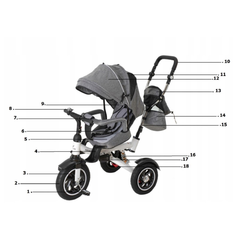 Madlo, poťah sedadla s popruhmi aj vodidlo pre rodiča sa dajú odňať, čím sa bicykel prispôsobí potrebám rastúceho dieťaťa.