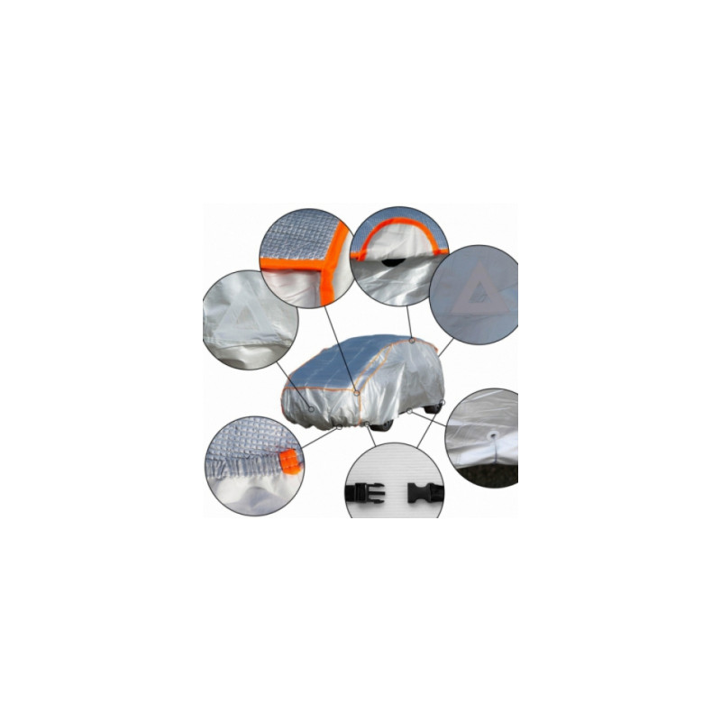 Materiál: reflexná vonkajšia vrstva v hornej časti autoplachty chráni pred UV žiarením a všetkými nepriaznivými a poveternostnými podmienkami. Druhá mäkká vrstva z pevného PVC s hrúbkou 5mm je schopná chrániť vozidlo pred poškodením spôsobeným krupobitím. Autoplachta je vybavená slučkami, ktoré umožňujú pripevnenie k vozidlu pomocou pribaleného lana a visacieho zámku. Ponúka tiež reflexné pruhy na zvýšenie viditeľnosti v noci. Autoplachta je dodávaná s taškou pre praktické uskladnenie.