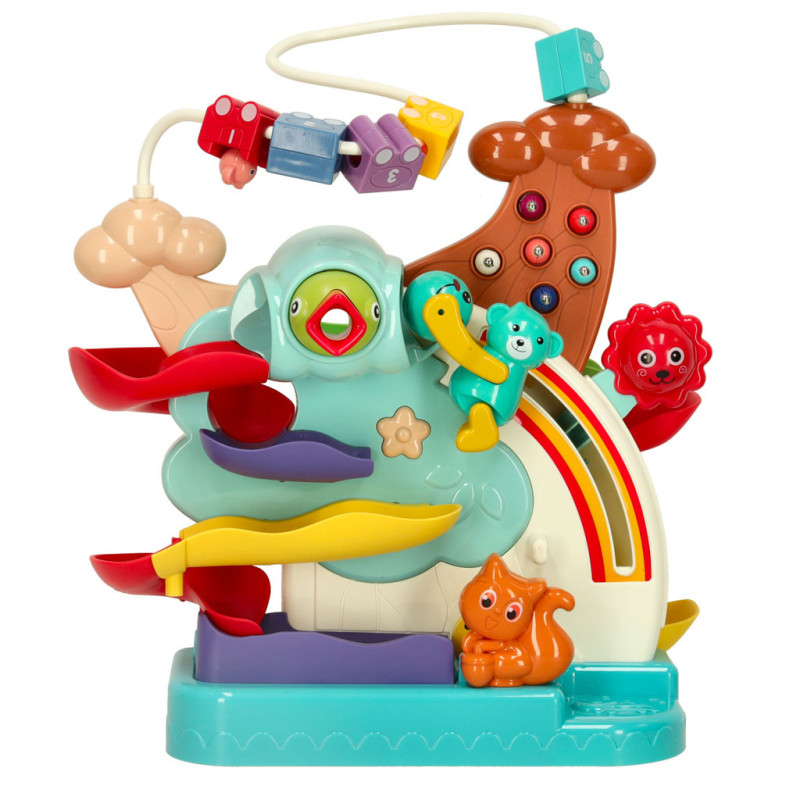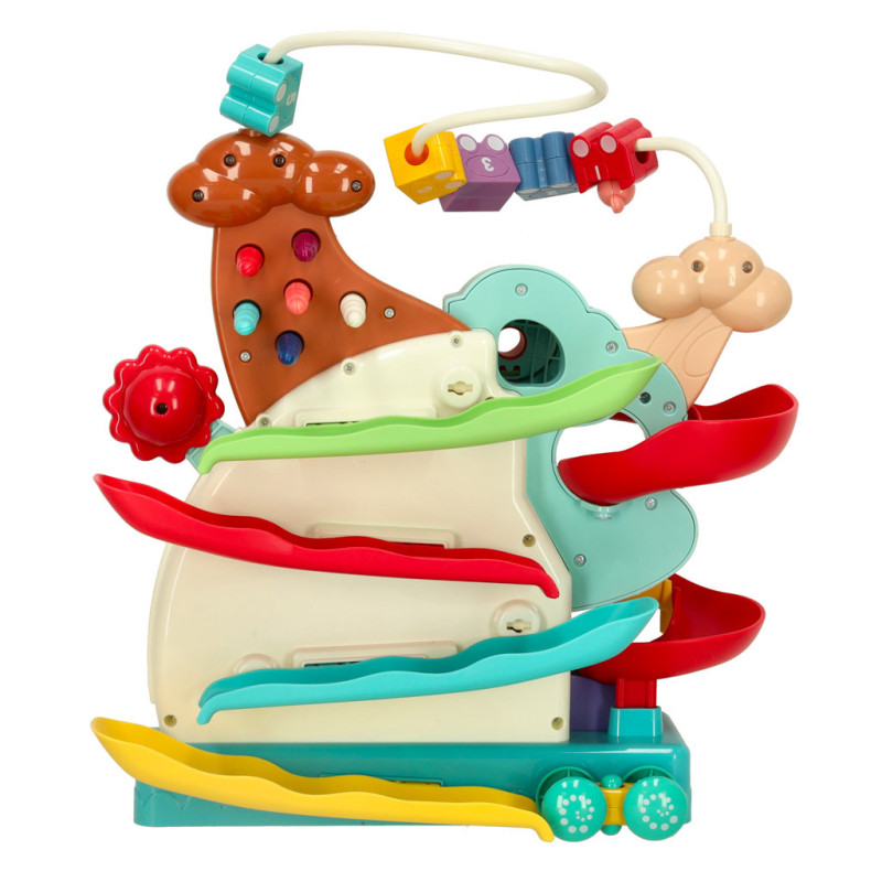 Hračka má nie jednu, ale až dve dráhy, po ktorých sa môžu kotúľať farebné loptičky alebo autíčko. Ďalšou atrakciou sú farebné vagóniky s číslami, ktoré môže vaše dieťa presúvať a otáčať. Obsahuje aj hru 'nakŕm vtáčika', ktorá spočíva v zbieraní červíkov a kŕmení vtáčika.