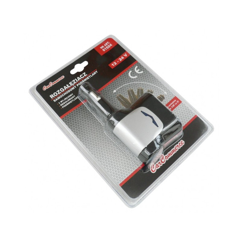 Zástrčka zapaľovača - roztrojka 12 / 24 V Rozmery: VSTUP ---> 12/24 V - standard VÝSTUP ----> 3 x 12/24 V - standard - 10 A max Podsvietený